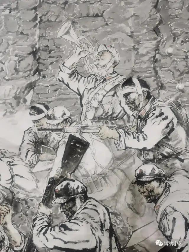 王晓银的这幅《西路军血战永昌》作品选取了永昌郭家上磨庄战斗遗址作为主场景,描绘的正是1936年12月,红九军27师在郭庄上磨庄遭遇马家军,和敌人进行激烈战斗的悲壮场景。整幅作品以黑白色为主色调,悲壮震撼,在黑白的色调中,红色旗帜、红色帽徽、红色领章熠熠夺目,它们不仅是西路军精神的象征,更是无数中国共产党人用鲜血和生命铸就的信仰。