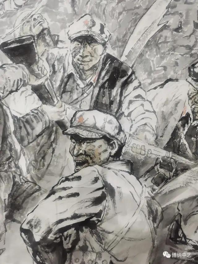 从创作上技法上来看,整幅长卷采用了中国画的传统创作技法“散点透视法”,这种技法的运用使得作品的任何一处截选出来都是一个故事、一幅作品,从而使画面更加完整丰富、立体生动。在郭家上磨庄庄墙的创作上采取了较为现代的绘画形式,与传统勾线的绘画方式不同的是,画面整体以黑色墨块相构成,突出红色历史题材的厚重感。现代和传统技法的交替使用,体现了王老师作为文艺工作者对绘画艺术地创新探索和精益求精,也使得红色历史题材的艺术作品在新时代焕发出现代艺术的魅力。